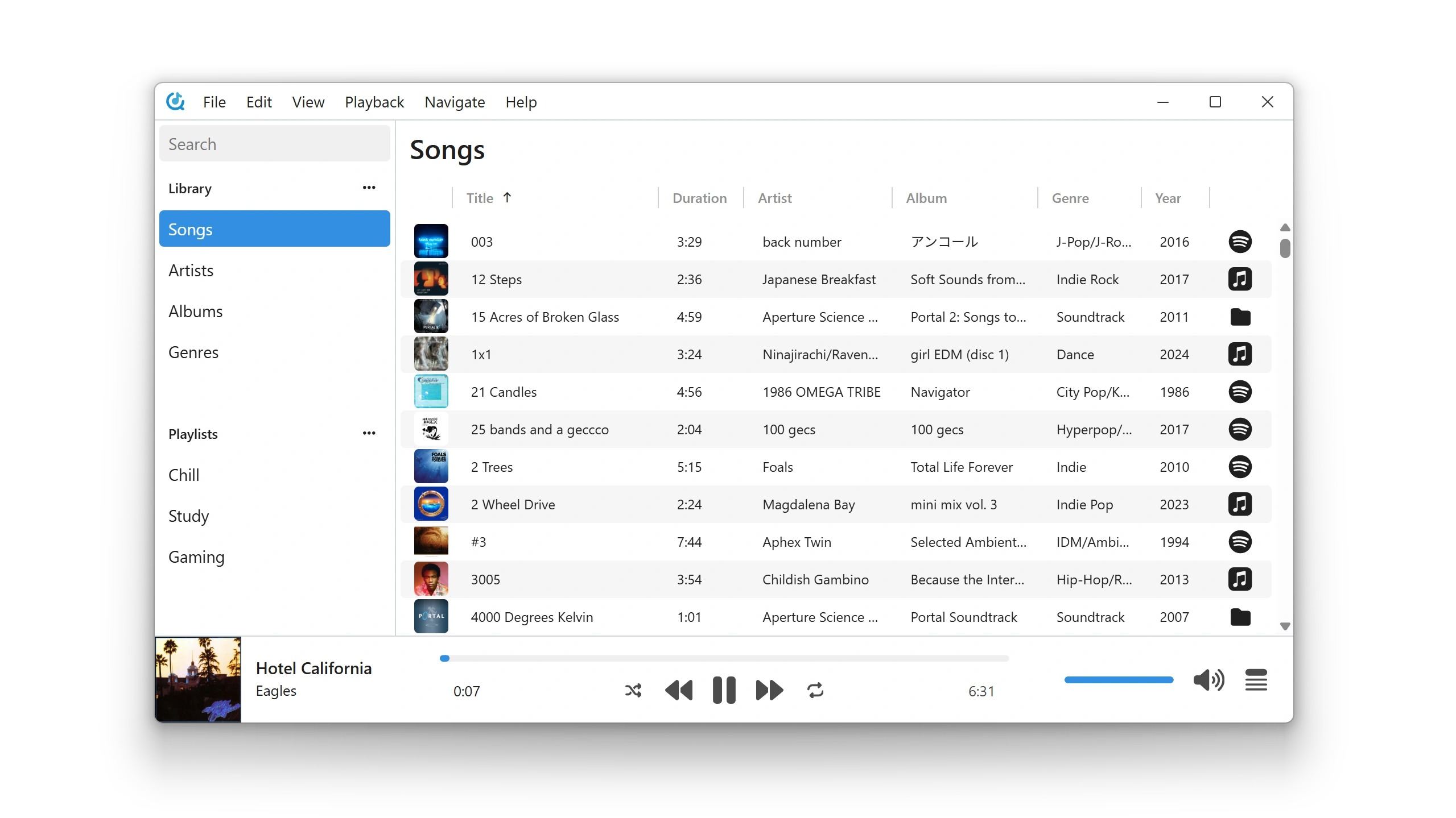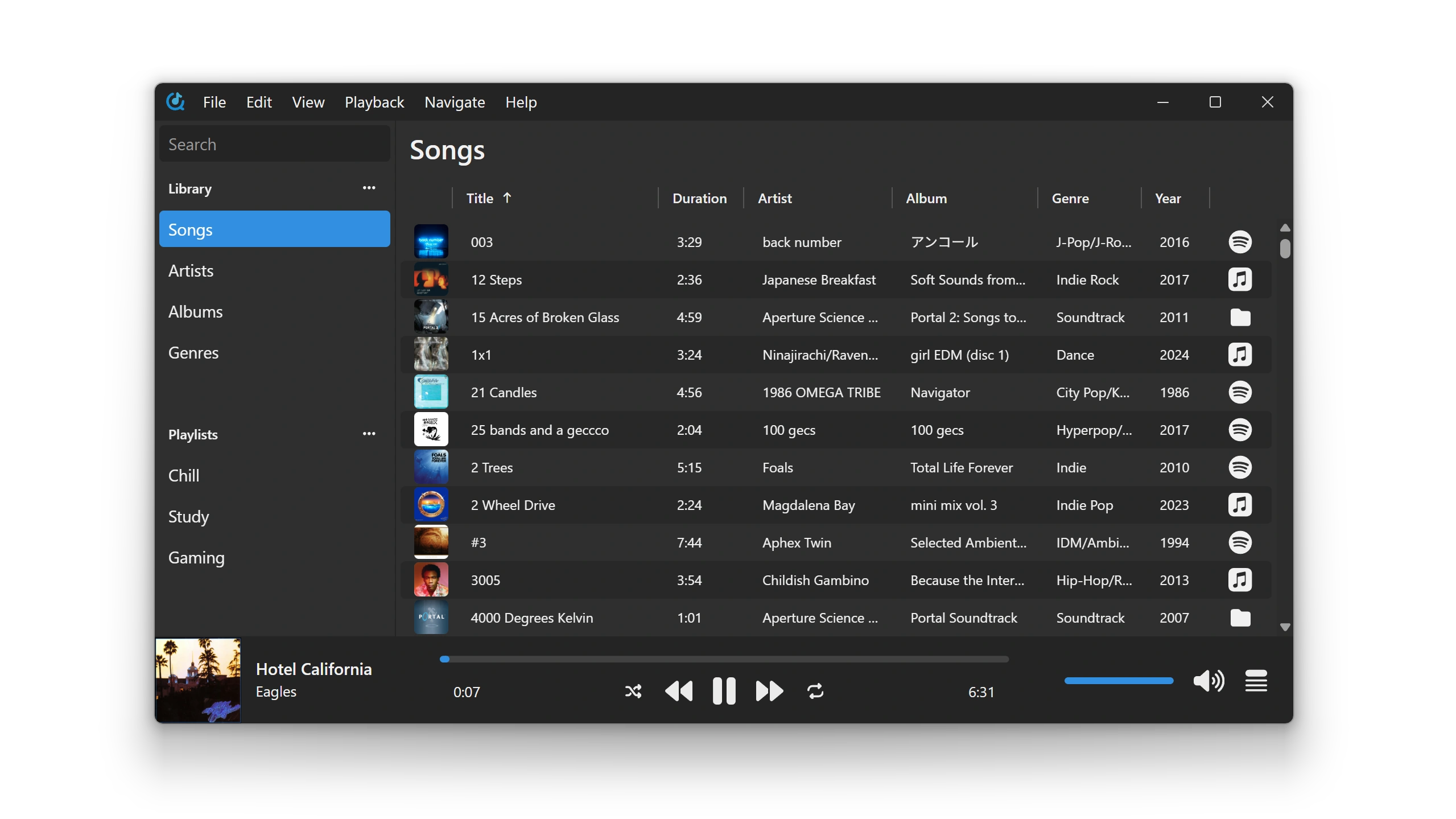 Aria is a desktop music player available for Windows, macOS, and Linux. It aims to provide a clean yet powerful user interface for music library management. Aria contains most of the features you would expect from a typical music player like playlists and a queue, but it also includes a plugin system for connecting to external services.